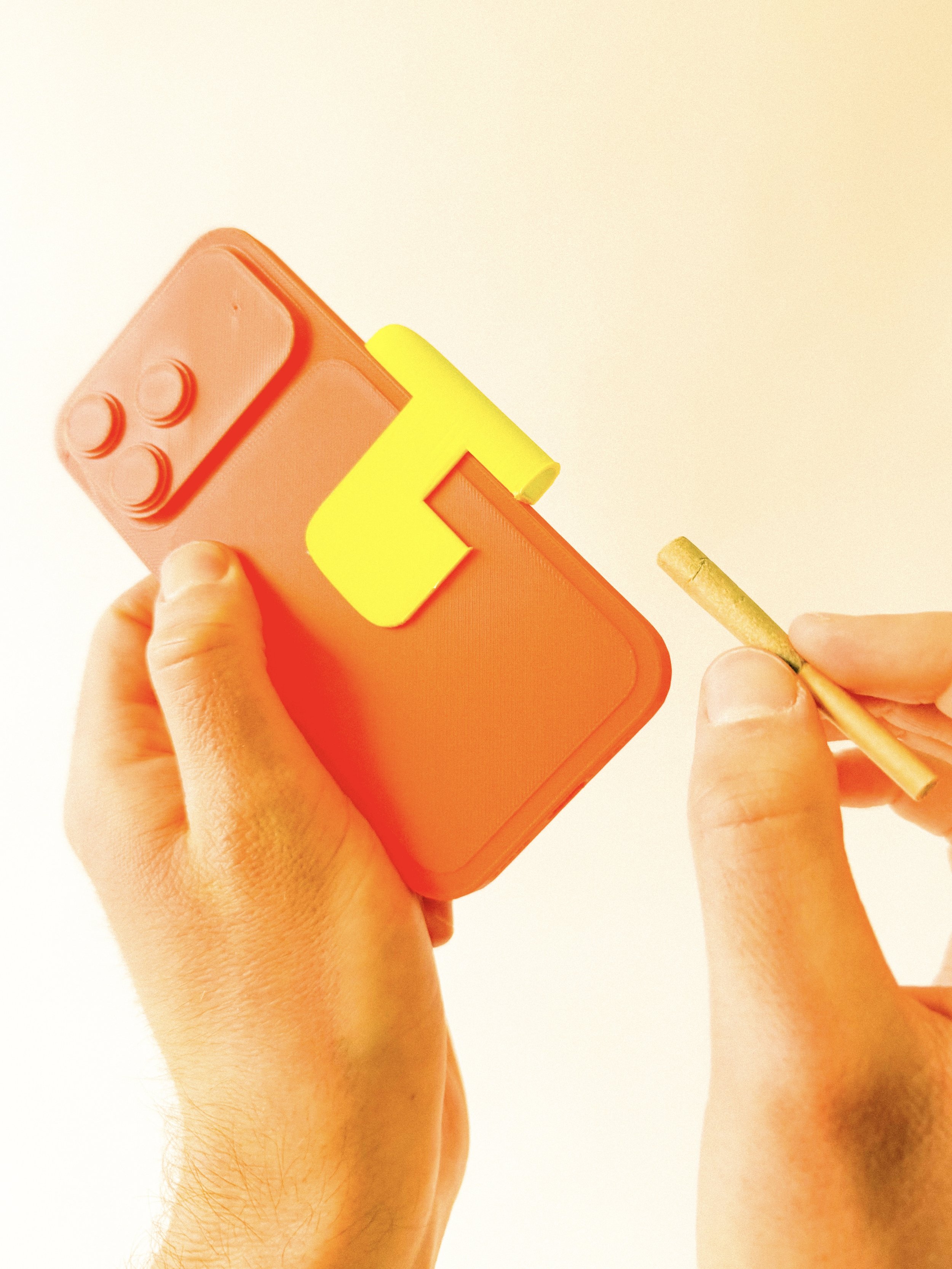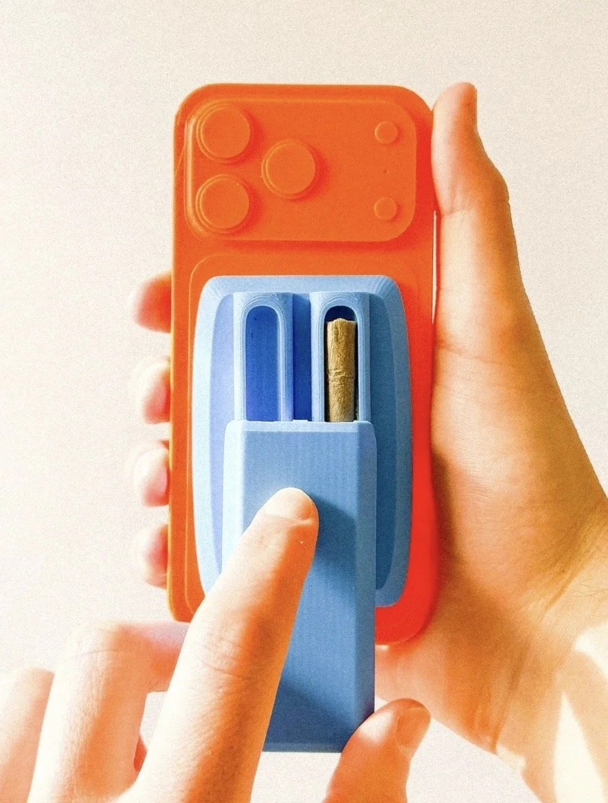 This Spacecase prototype features a removable pre-roll container designed to attach cleanly to the back of your phone. The container is shaped to match the form of a pre-roll and securely holds it in place while remaining easy to remove when needed. The modular design allows the container to be swapped or changed in color, giving flexibility in how the Spacecase looks and functions.