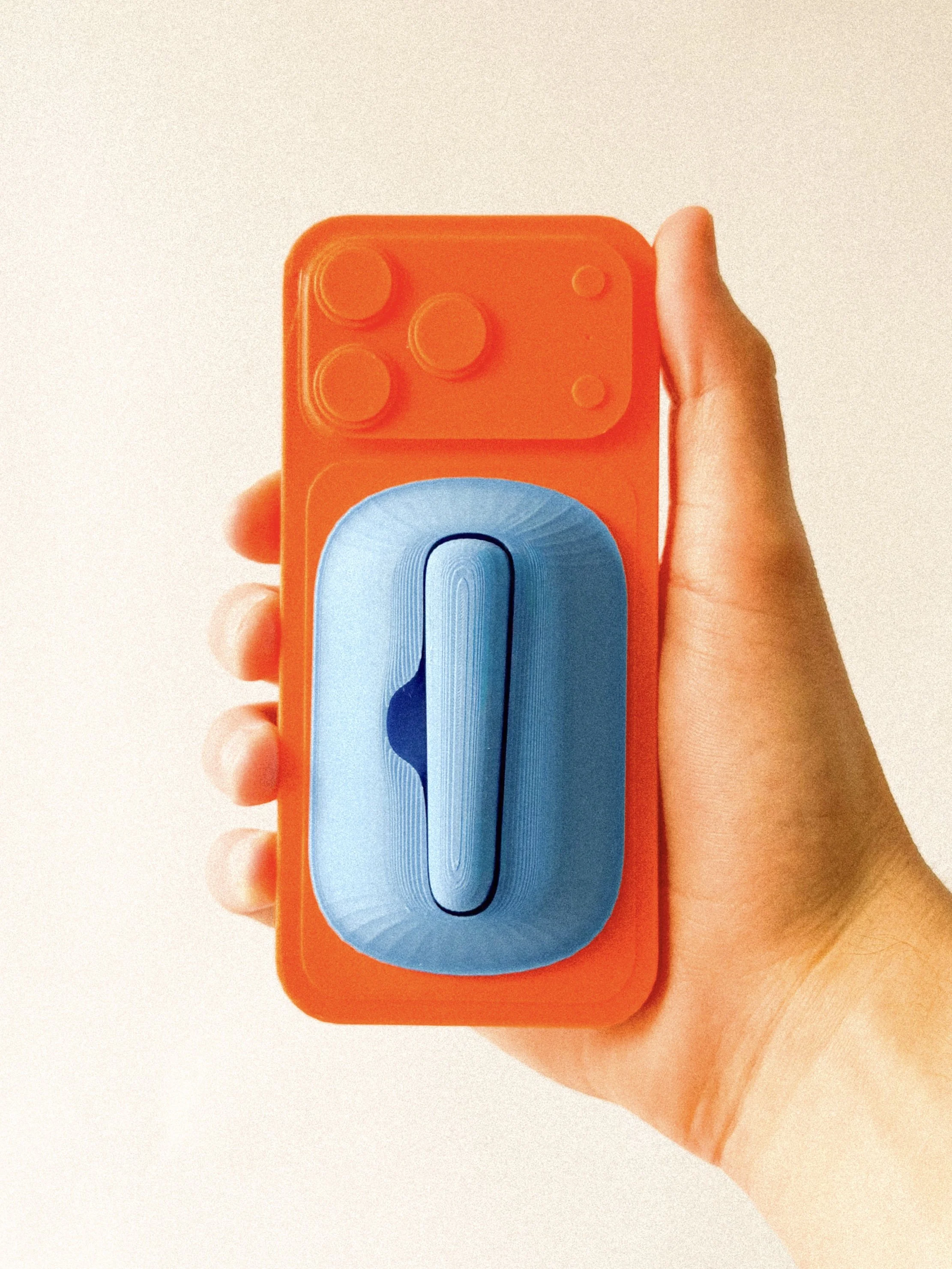 The Spacecase Jetpack prototype features two smooth, elongated oval forms that create a bold yet minimal silhouette. The rounded geometry feels comfortable in the hand while giving the object a sense of motion and energy. Inspired by the idea of a jetpack, the shape feels futuristic and intentional, designed to suggest creativity, focus, and forward momentum without revealing what’s inside.